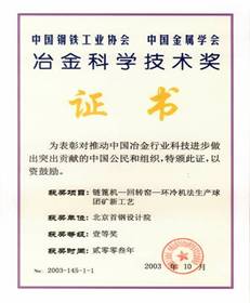 2000年,率先開發成功的鏈篦機-回轉窯-環冷機球團技術填補了中國大型球團技術的空白,并完成國內第一條120萬t/a規模鏈篦機-回轉窯-環冷機生產線建設,獲冶金科技進步一等獎。